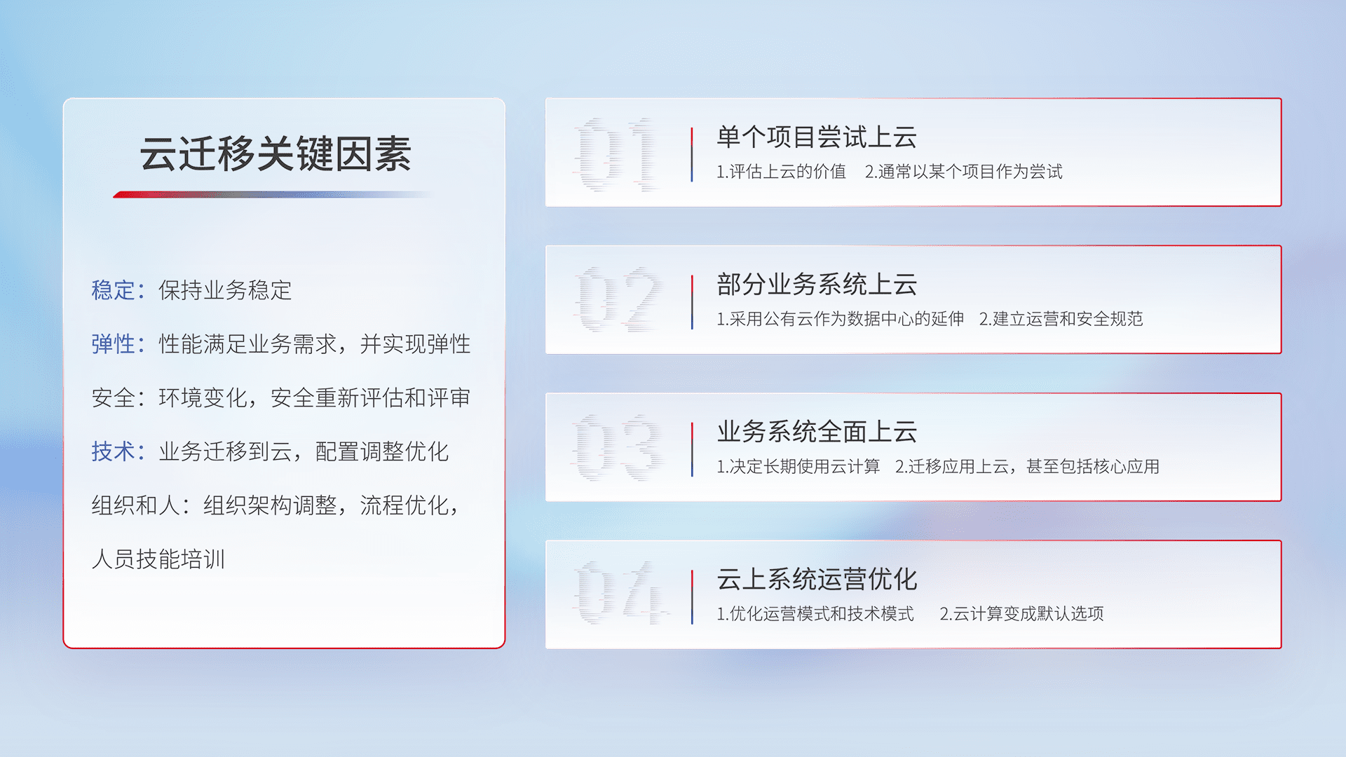 结合实际业务,,,,从规划设计、、、、云平台选型、、云原生改造、、数据迁移、、、、集成交付,,,,迁移全过程为客户识别最佳上云路径,,,做好风险识别管理,,设计网络架构、、、身份权限、、安全审计合规、、操作审计、、日志审计、、、监控告警策略、、、、多站点容灾设计等,,对云上基础设施进行整体规划,,提升IT治理水平,,,,以满足弹性、、高可用、、高性能的需求。。